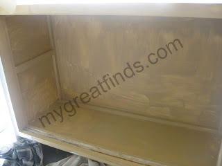 So once that was done my idea was to paint the outside a chippy black paint and the inside a burlappy beige color that would look great with the baskets I had for the bottom.